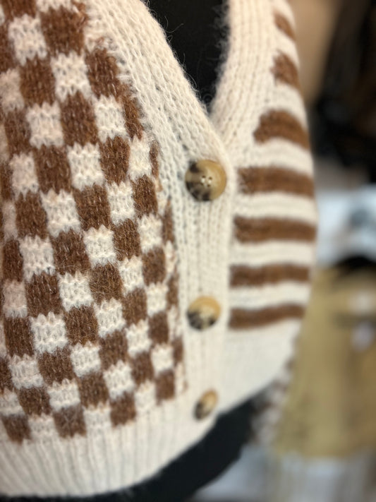 Stripe and Checkered Drop Shoulder Cardigan - Brown