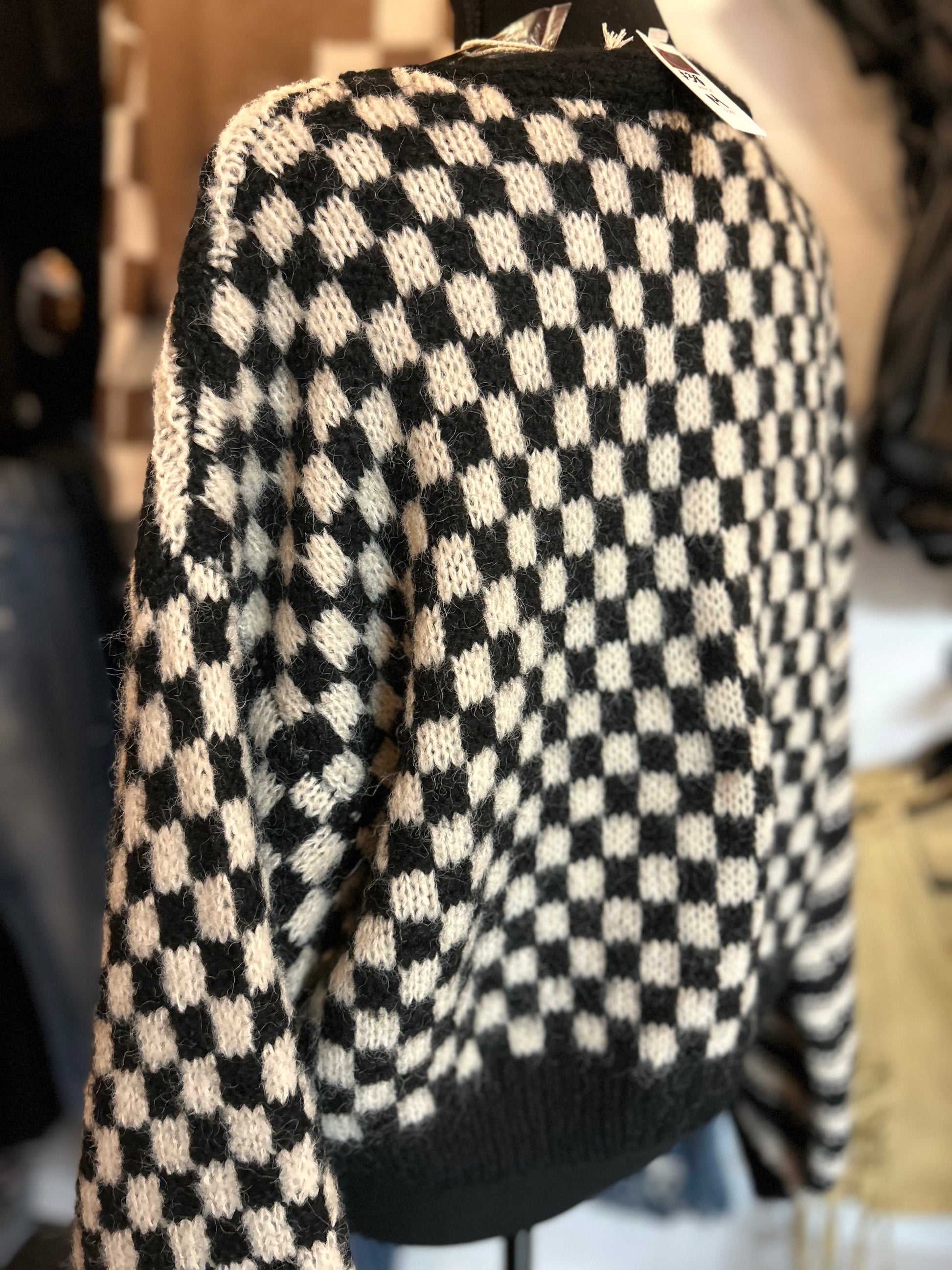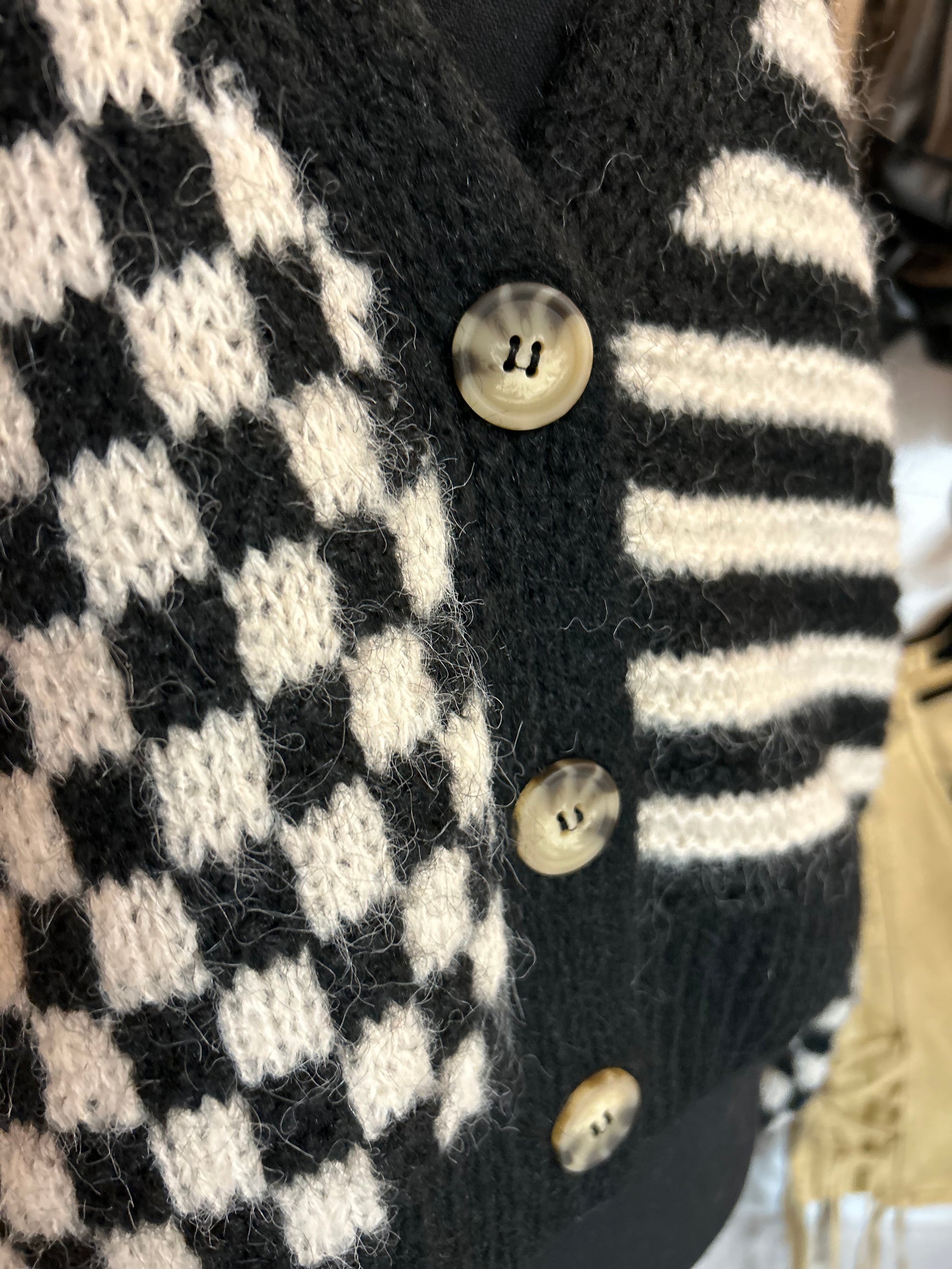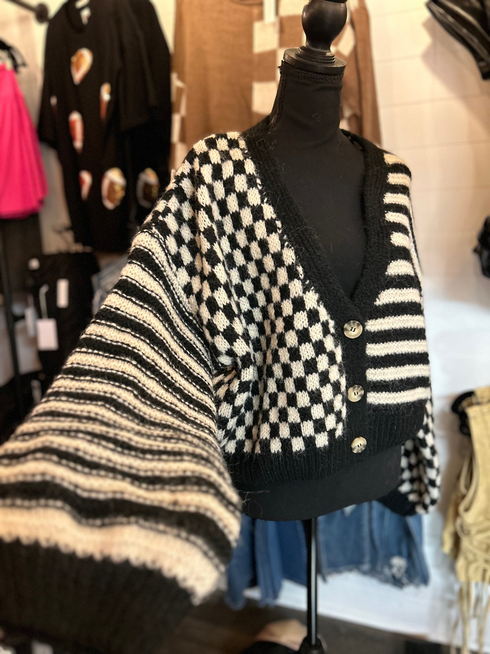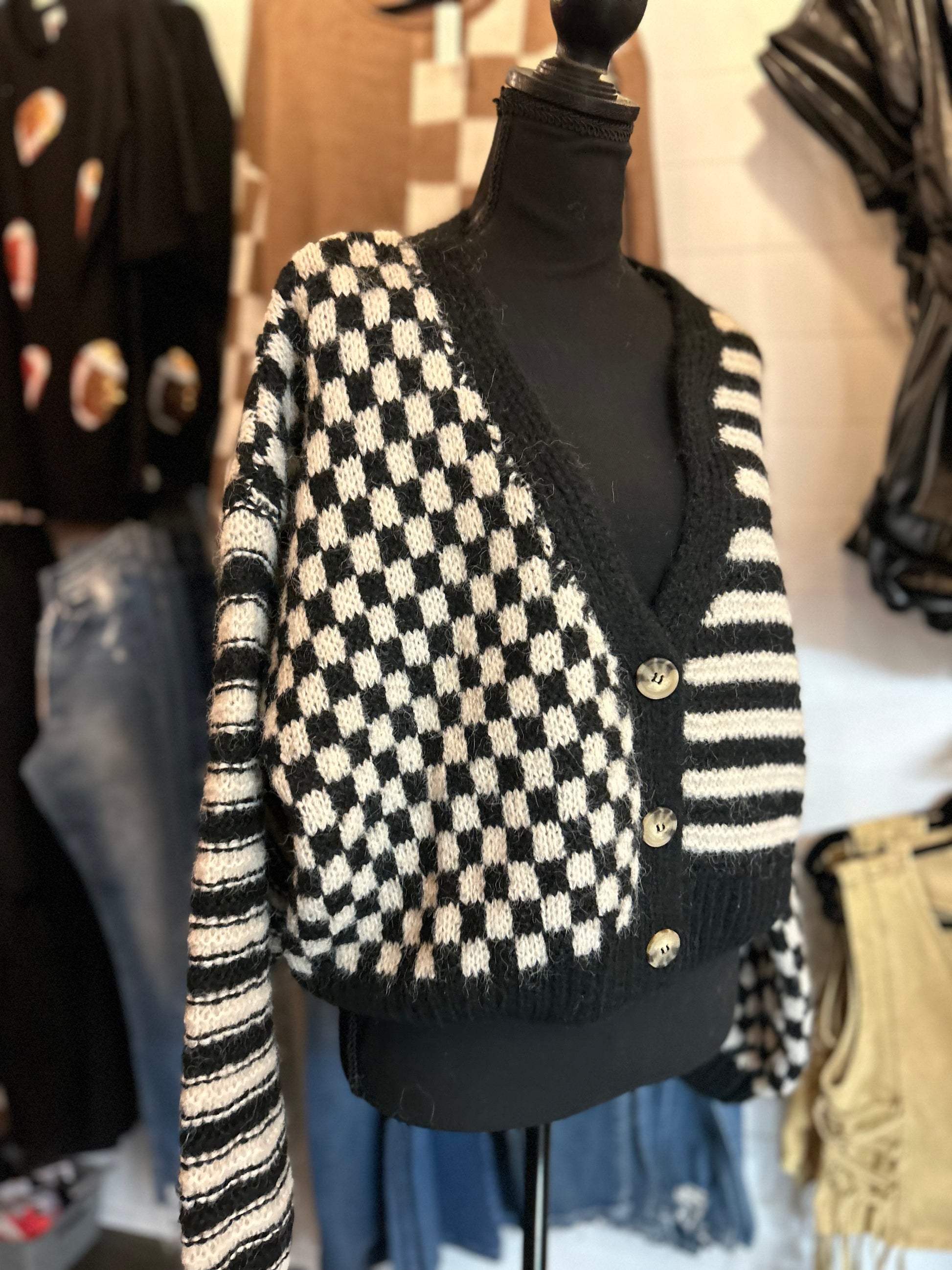 Stripe and Checkered Drop Shoulder Cardigan - Black