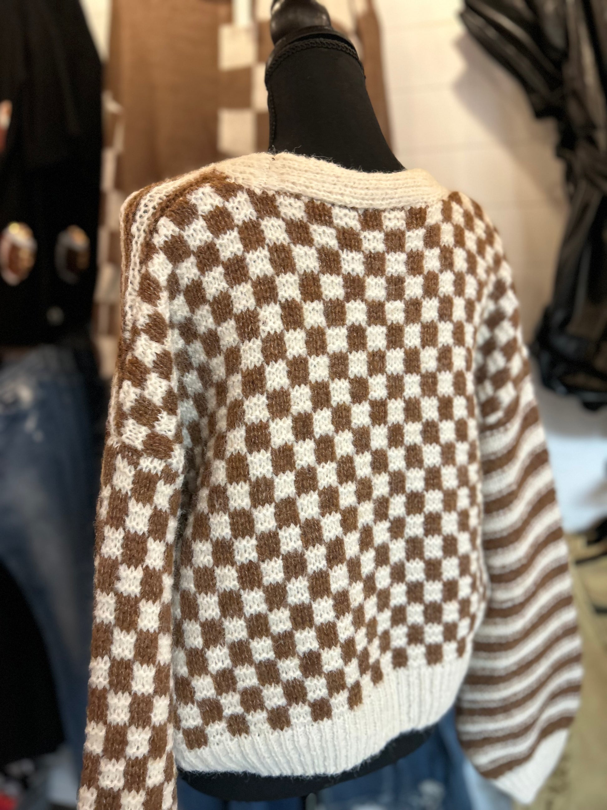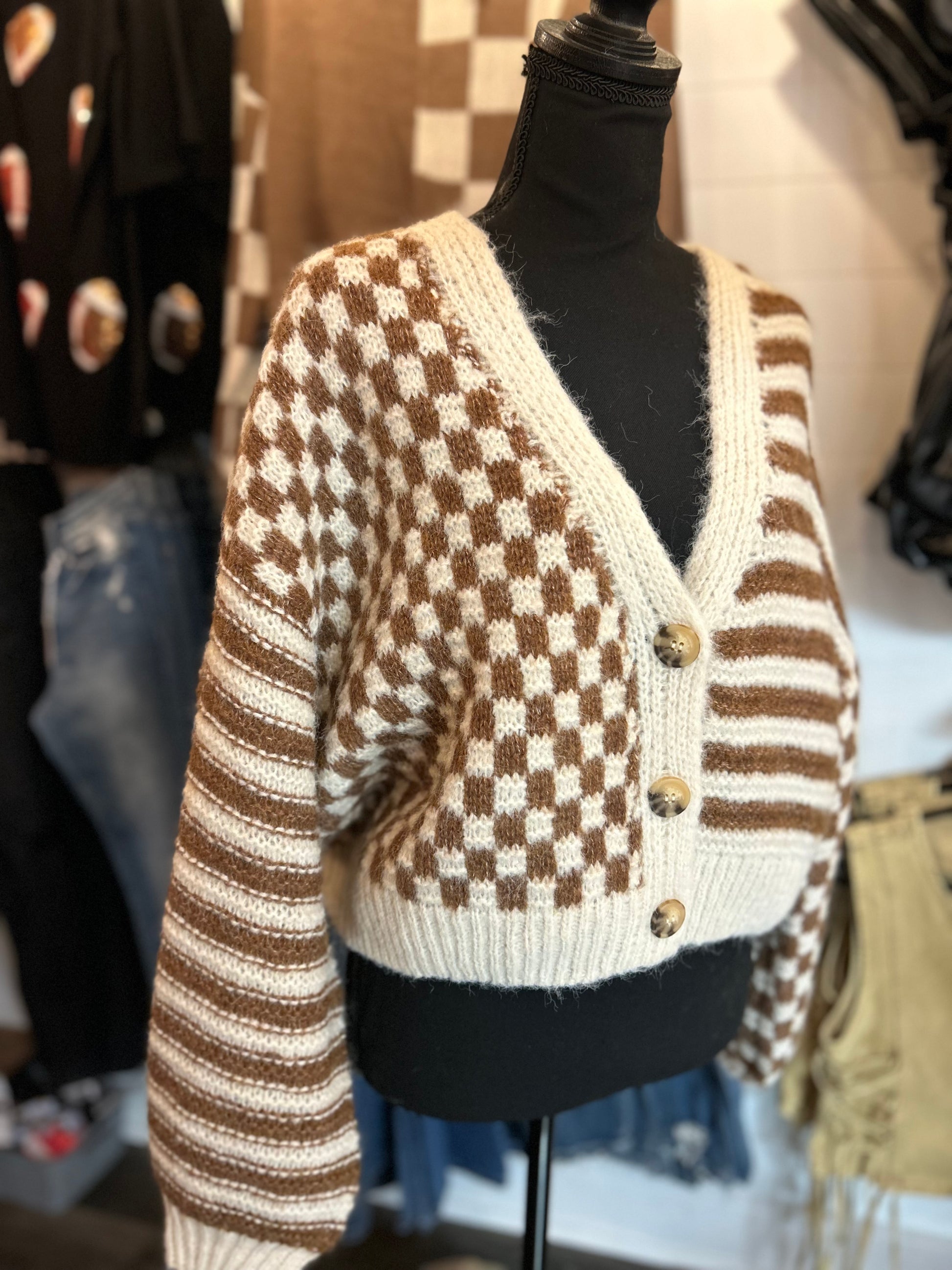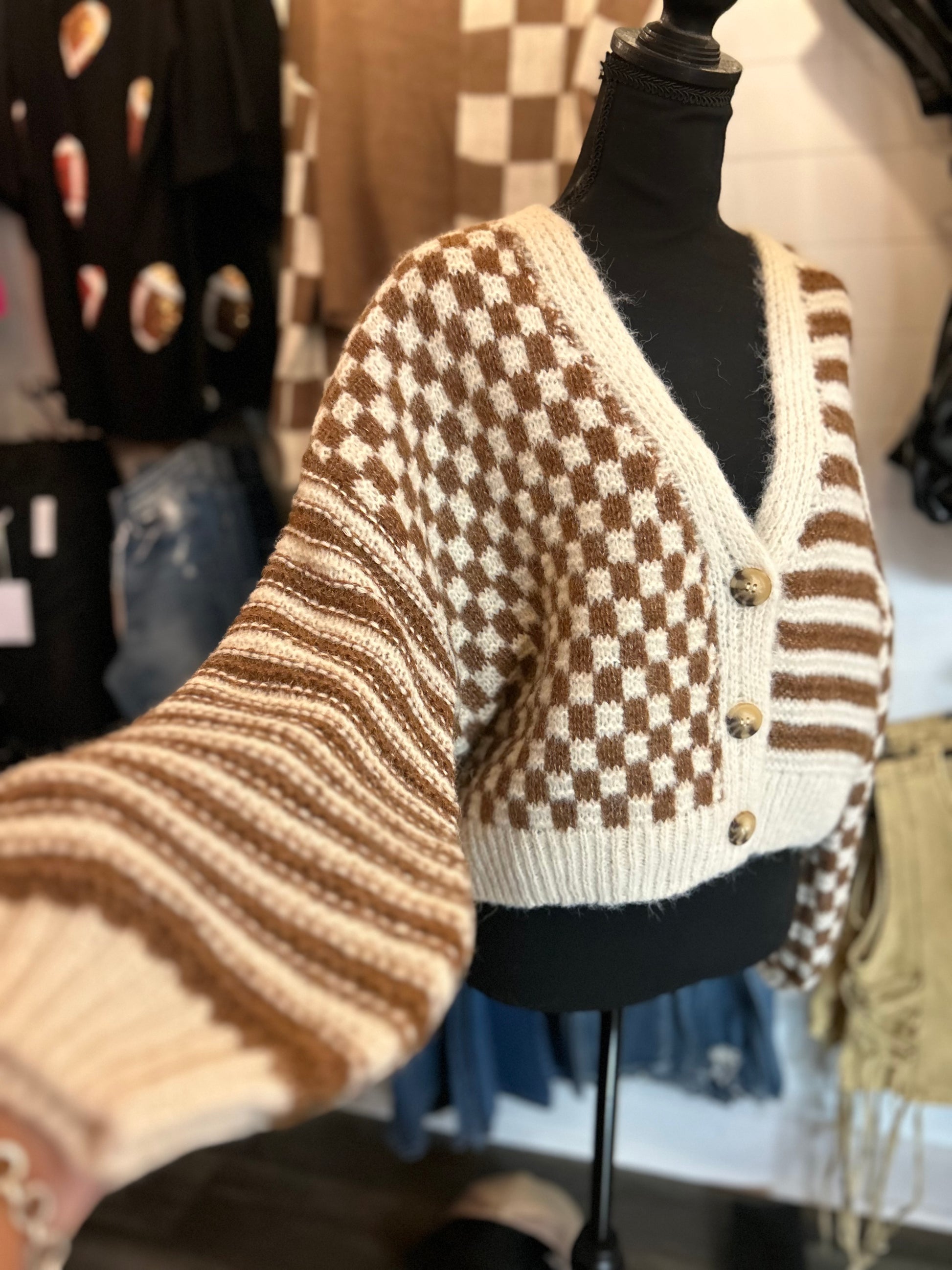 Stripe and Checkered Drop Shoulder Cardigan - Brown